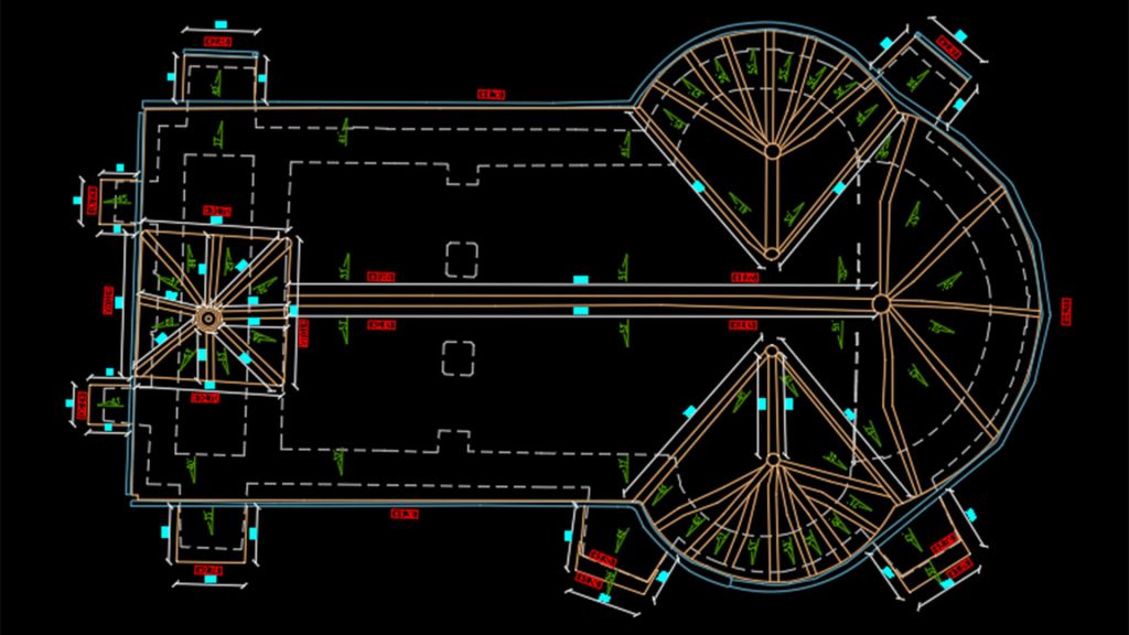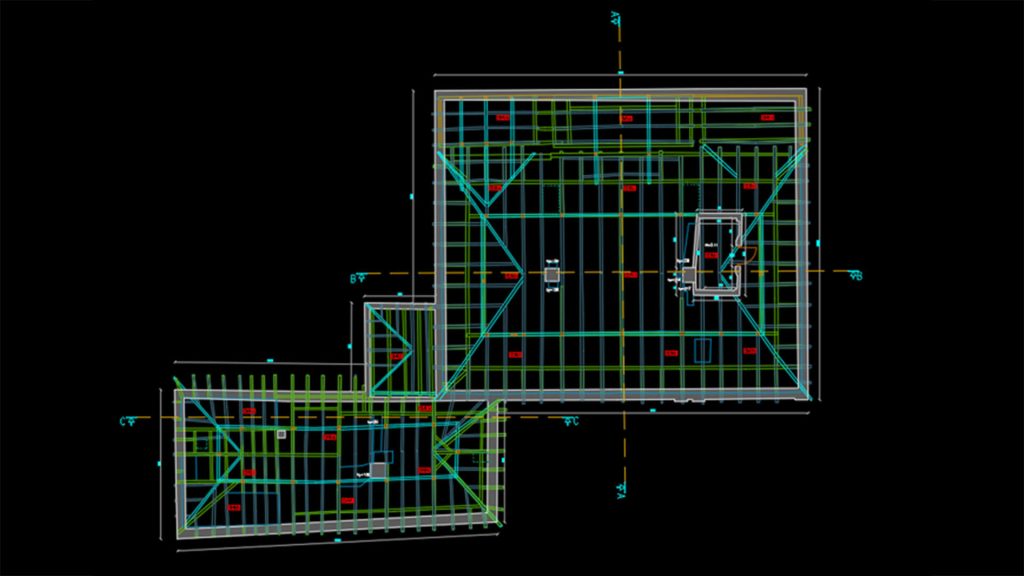 The roofing plan depicts a top view of the finished roof. It is necessary to specify the dimensions at this level, the shape of the roof, the lines resulting from the intersection of the inclined planes, as well as the position and dimensions of skylights, roof windows, chimneys or ventilation ducts.